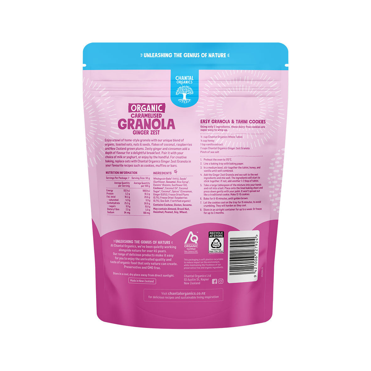 Pair it with your choice of milk or yoghurt or enjoy by the handful. For creative baking, replace oats with Chantal Organics Ginger Zest Granola in your favourite recipes such as cookies, muffins or bars.