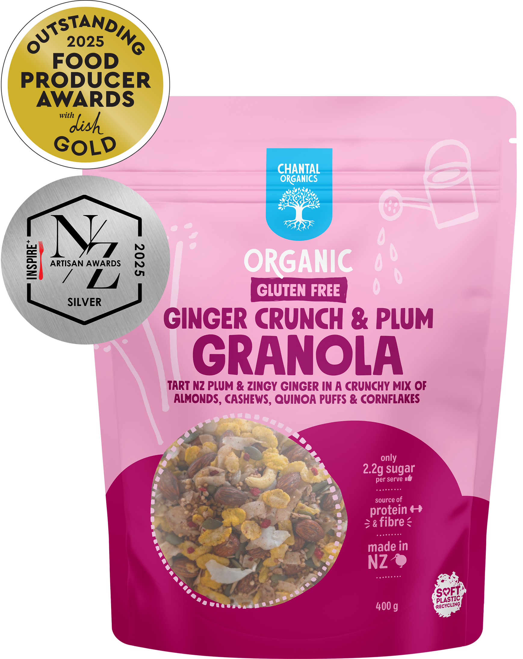Our unique blend of nuts and superseeds makes Chantal Organics Gluten Free Ginger Crunch & Plum Granola a smart start to your day. Sunflower, pumpkin and hemp seeds mingle with roasted almonds and cashews, all rolled together with crispy cornflakes, NZ plum and ginger for the most delicious way to fuel your mornings.