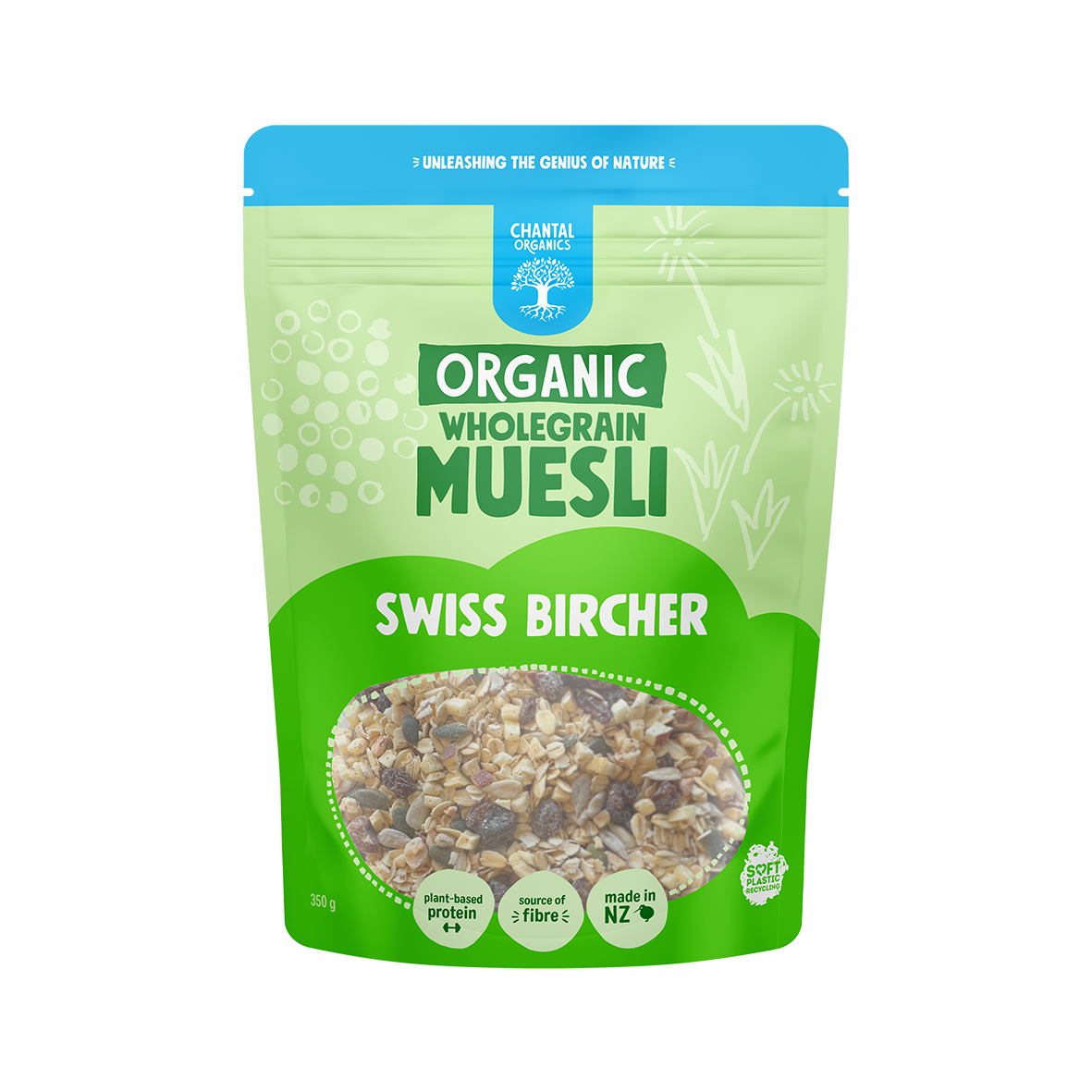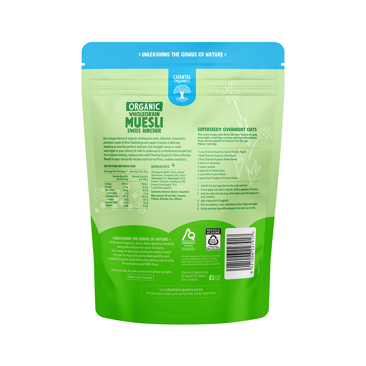 Our unique blend of organic wholegrain oats, almonds, hazelnuts, pumpkin seeds & New Zealand grown apple creates a delicate sweetness and the perfect texture. Eat straight away or soak overnight in your choice of milk to wake up to a wholesome breakfast. For creative baking, replace oats with Chantal Organics Swiss Bircher Muesli in your favourite recipes such as muffins, cookies and bars.