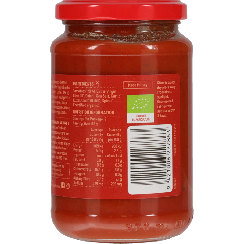 Tomatoes* (96%), Extra-Virgin Olive Oil*, Onion*, Sea Salt, Garlic* (0.5%), Chilli* (0.25%), Spices*. (*certified organic)