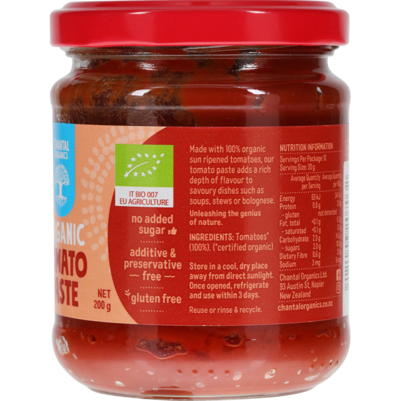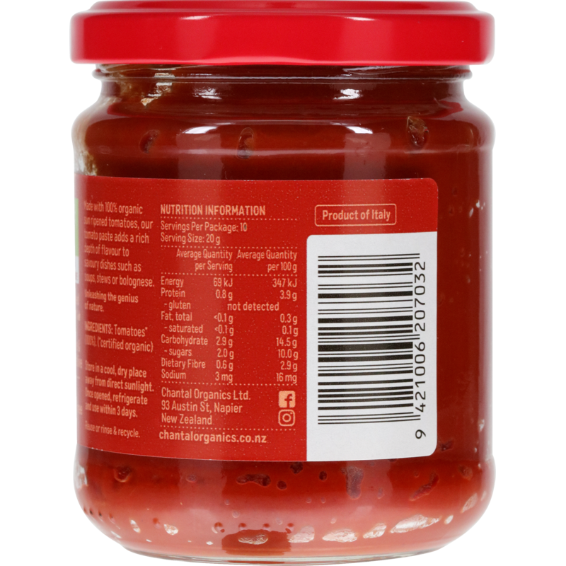 Made with 100% organic sun ripened tomatoes, our tomato paste adds a rich depth of flavour to savoury dishes such as soups, stews or bolognese.
